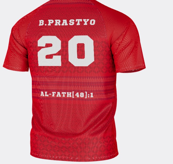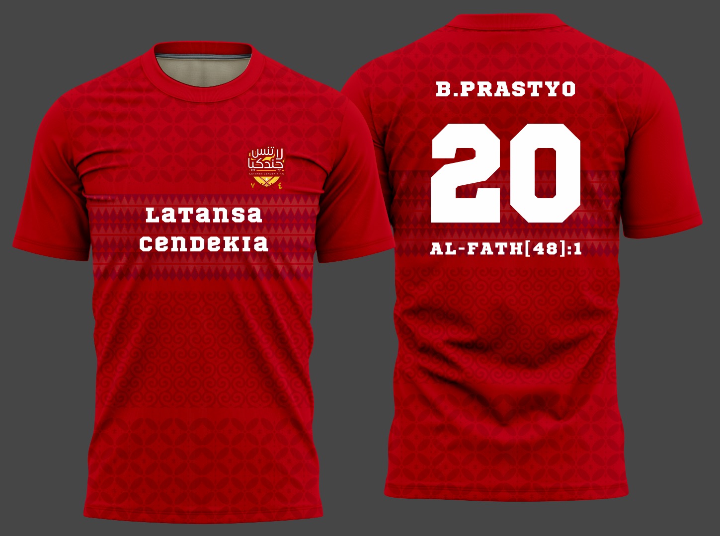 Seragam pertama kami sepakat dengan warna merah, yang melambangkan semangat 17 Agustusan. Damn! seragam ini nantinya juga dapat digunakan pada momen 17an. Saya menambahkan ornamen batik dari berbagai daerah pada jersey, melambangkan kebhinekaan, sebab kami dilatarbelakangi dari berbagai daerah. Di sana ada batik Jawa, Lampung, dan Kalimantan. Saya gunakan teknik shadow dengan opasitas yang saya turunkan dari warna asli yaitu coklat. Untuk seragam pemain berwarna Merah, sedangkan Goal Keeper berwarna Ungu, melambangkan warna lokal Kabupaten Tangerang. Tampak depan ada tulisan "Latansa Cendekia" dengan font "Sport World", font ini dipilih karena sedang mengikuti trend ke-kini-an. Tampak belakang ada nomor punggung yang di bawahnya ada tulisan "Al-Fath[48]:1" yakni nama sebuah ayat Al-Qur'an tentang kemenangan Rasulullah. Pesan ini kami bawa sebagai semangat dakwah.