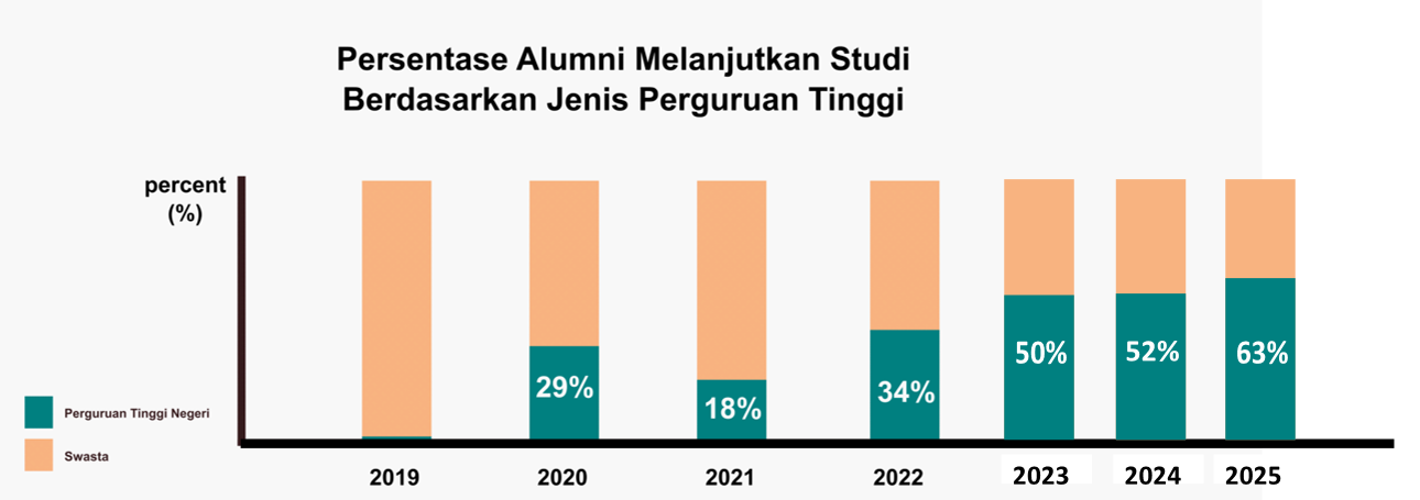 Dalam dua tahun terakhir, saya sebagai Wakil Kepala Sekolah Bidang Kurikulum telah memimpin berbagai program strategis yang berdampak signifikan terhadap peningkatan kualitas pembelajaran dan hasil akhir siswa, khususnya dalam capaian kelulusan ke Perguruan Tinggi Negeri (PTN). Data pada grafik menunjukkan bahwa terdapat lonjakan persentase siswa yang diterima di PTN, dari 34% pada tahun 2023 menjadi 50% di tahun 2024, dan kembali meningkat cukup tajam menjadi 63% di tahun 2025. Peningkatan ini tidak hanya menggambarkan keberhasilan siswa, tetapi juga menunjukkan efektivitas manajemen kurikulum, pembinaan akademik, serta inovasi pembelajaran yang telah kami terapkan secara konsisten.