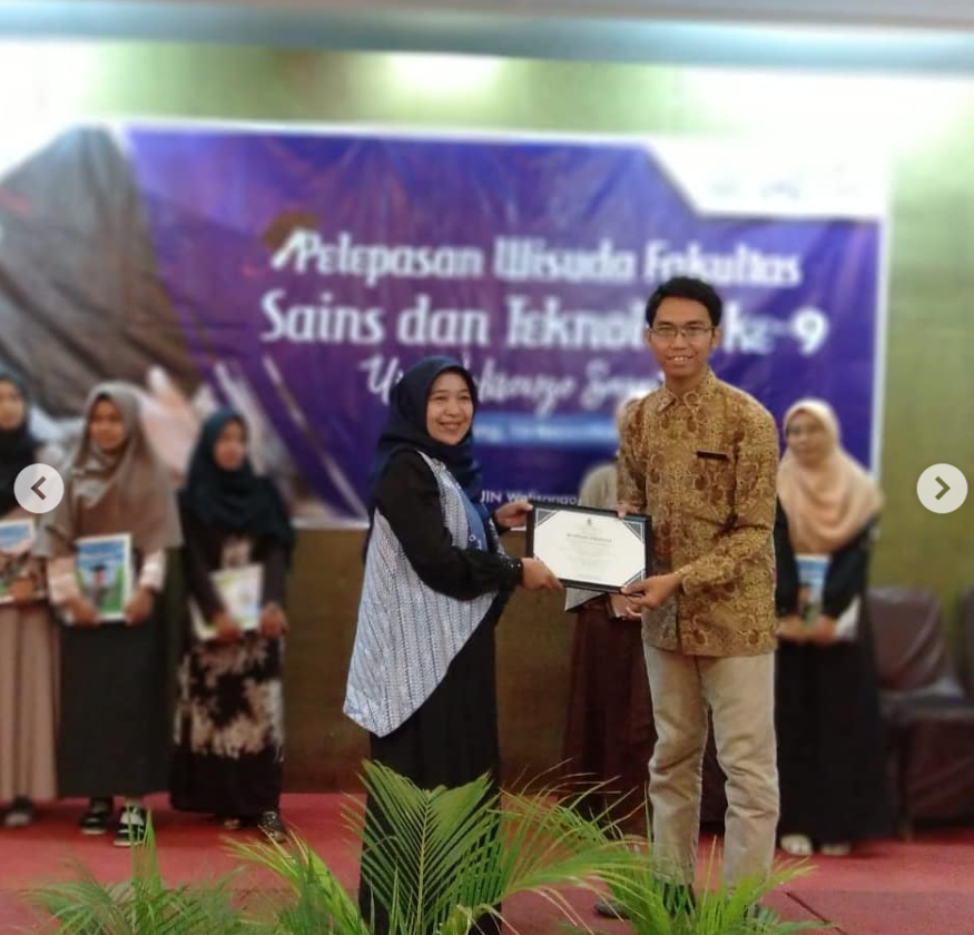 Kemudian, saya melanjutkan pendidikan di UIN Walisongo Semarang, mengambil jurusan Pendidikan kimia. Saya merantau dan jauh dari orang tua setelah baru saja saya merasakan satu atap bersama orang tua. Tahun 2015, saya lulus sebagai wisudawan terbaik Fakultas Sains dan Teknologi dengan IPK 3,92, hasil dari perjalanan panjang yang saya isi dengan belajar, prestasi, riset, dan aktivitas organisasi. Selama kuliah, saya meraih berbagai penghargaan seperti Juara 1 Desain Grafis Nasional, finalis lomba ilmiah, penerima dana penelitian, serta menulis di jurnal nasional, sambil aktif di berbagai organisasi seperti KAMMI, SEMA FST, Warstek, dan komunitas yang saya dirikan sendiri. Manajemen waktu yang disiplin membuat saya mampu menyeimbangkan kegiatan akademik dan organisasi, dan pengalaman ini memperkuat keyakinan saya bahwa karakter, adab, dan keberanian mengambil peluang lebih penting daripada sekadar mengejar gelar terbaik.