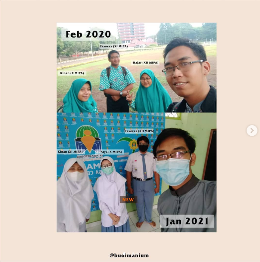 Gambar 7. Menemani anak berproses mencapai prestasi. (1) Atas: Dokumentasi ketika menjuarai lomba pertama kali sebagai guru baru yang mendampingi anak cerdas cermat di Universitas Indonesia (Juara 2) pada tahun 2020; (2) Bawah: Masa pandemi covid tidak menghalangi semangat anak untuk lomba di bidang yang sama, Juara 2 pada tahun 2021 di event yang sama.