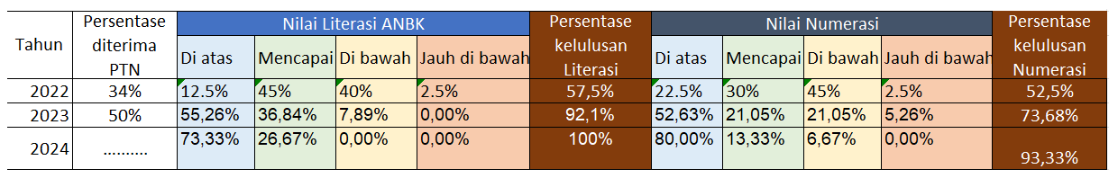 Tabel yang ditampilkan menunjukkan data dalam tiga tahun (2022–2024) mengenai: Persentase siswa diterima di PTN, distribusi nilai literasi dan numerasi menurut kategori ANBK (Asesmen Nasional Berbasis Komputer): di atas standar, mencapai standar, di bawah standar, jauh di bawah standar, dan Persentase kelulusan literasi dan numerasi.