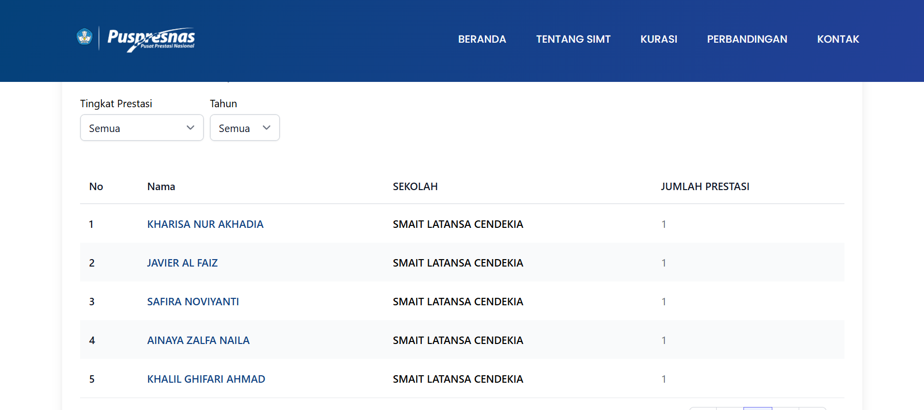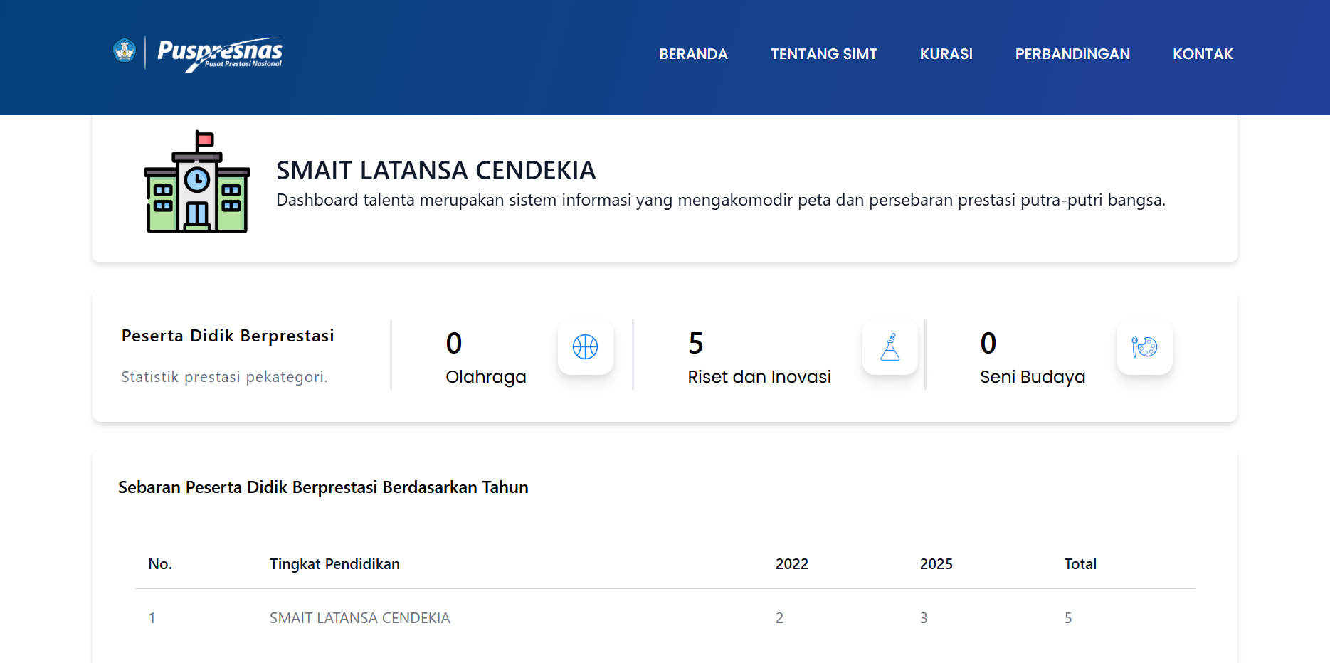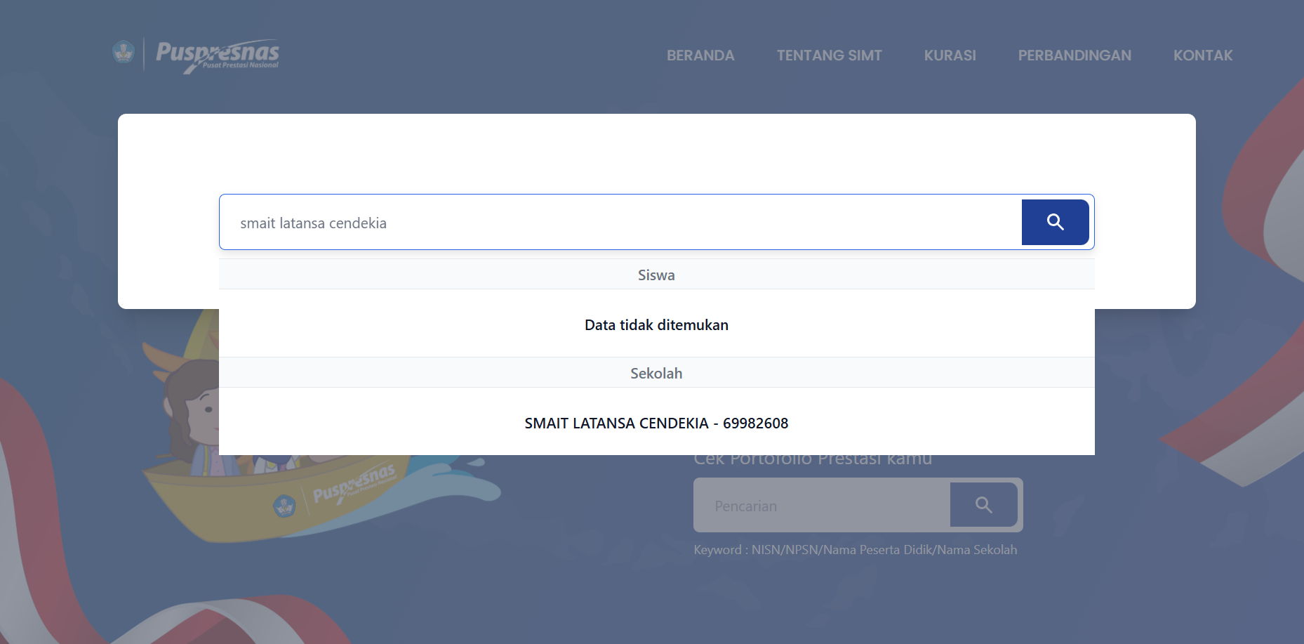 Kurasi prestasi adalah proses pendataan, verifikasi, dan pengakuan resmi terhadap capaian prestasi peserta didik melalui sistem yang disediakan oleh Kementerian Pendidikan Dasar dan Menengah (Kemdikdasmen). Melalui platform kurasi prestasi, berbagai penghargaan seperti lomba akademik maupun non-akademik dapat tercatat secara nasional dan tervalidasi. Kamu ingin cek prestasi suatu sekolah (yang memiliki prestasi terkurasi)? Silakan klik link https://simt.kemendikdasmen.go.id/ . Kemudian, kamu input nama sekolah atau nama siswa yang ingin dilihat prestasi terkurasinya.