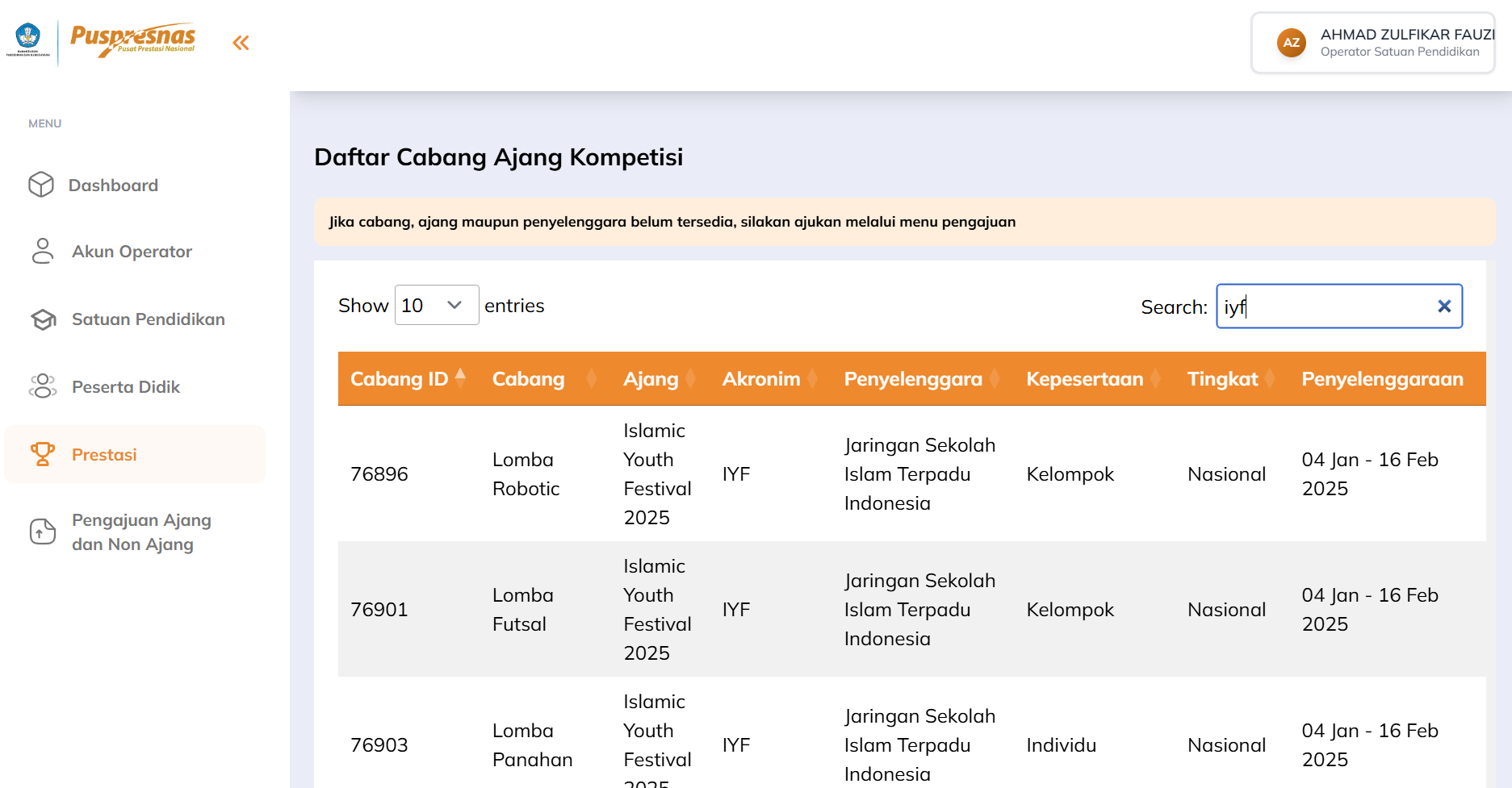 - - Nama lomba/kejuaraan (event yang terdaftar pada tabel pencarian ajang hanya yang terkurasi saja oleh Kemdikdasmen). Jika di pencarian ajang kompetisi/nonkompetisi/non-ajang tida ada, maka event tersebut bukanlah event yang terkurasi)
